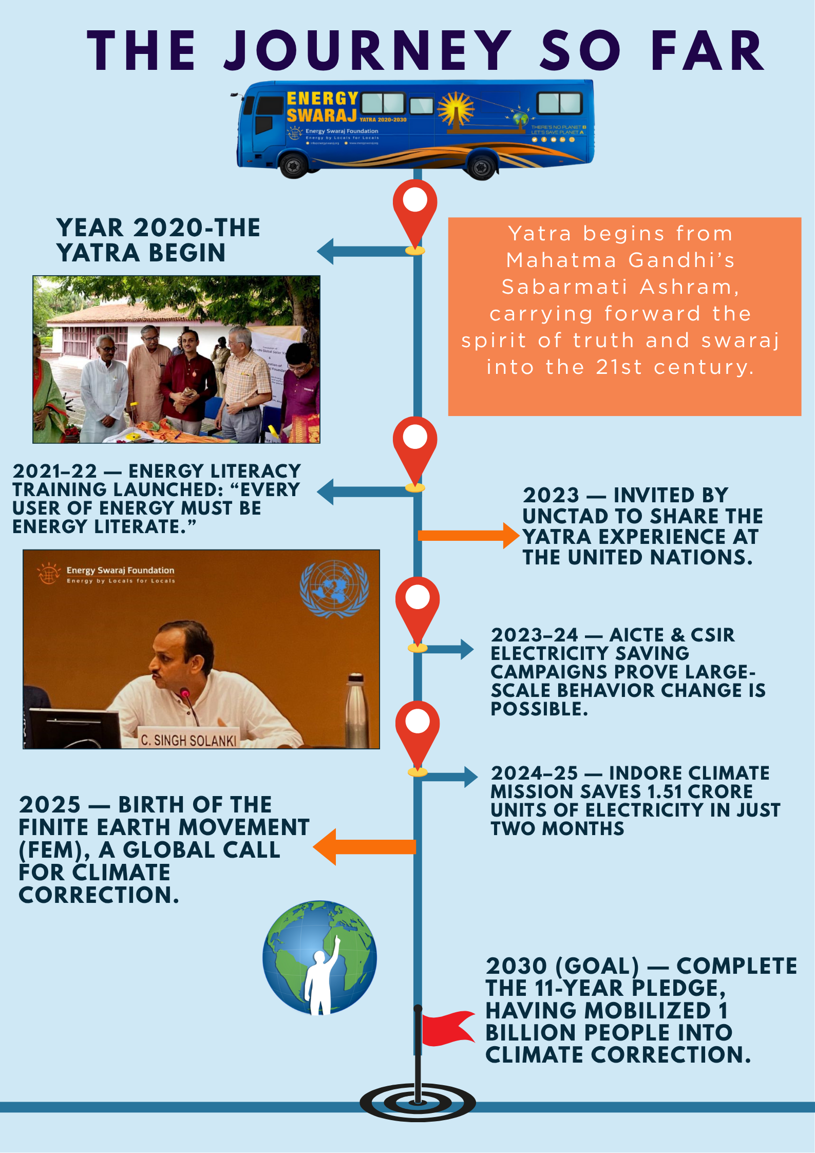The Energy Swaraj Yatra travels in a specially designed, solar-powered bus. This bus is more than a vehicle; it is a living example of finite living: