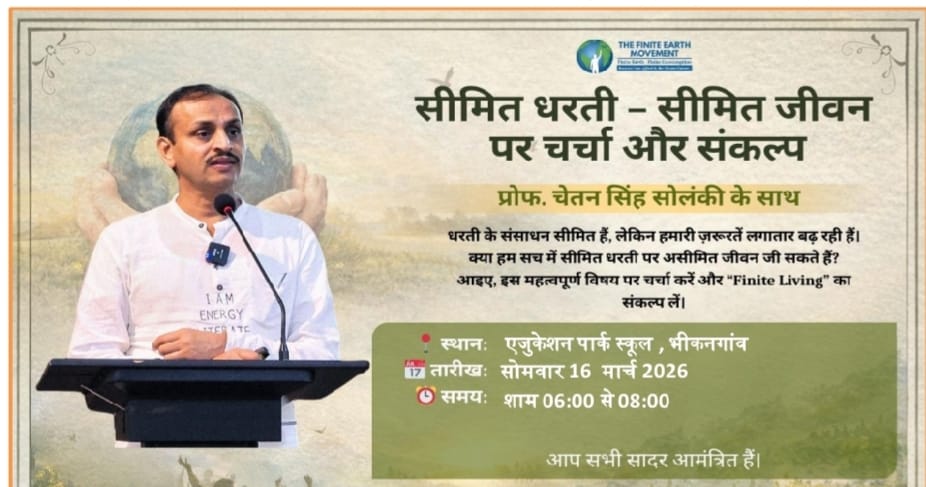 एजुकेशन पार्क स्कूल, भीकनगांव में 16 मार्च 2026 को शाम 06:00 बजे से 08:00 बजे तक “सीमित धरती – सीमित जीवन” विषय पर एक जागरूकता एवं संकल्प सत्र आयोजित किया गया। इस सत्र में प्रोफेसर चेतन सिंह सोलंकी के साथ पृथ्वी के सीमित संसाधनों, बढ़ती उपभोग प्रवृत्तियों तथा उनके कारण उत्पन्न हो रहे जलवायु परिवर्तन के प्रभावों पर विस्तार से चर्चा की गई।